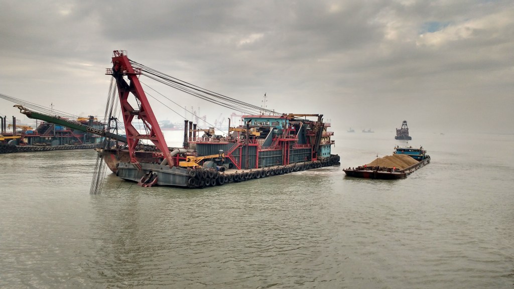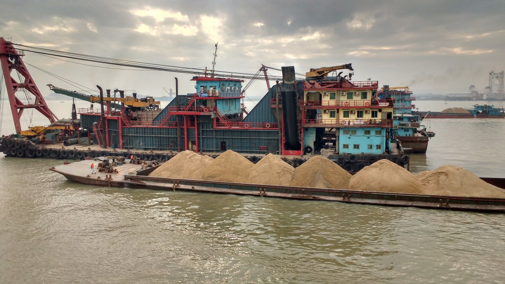 The river has numerous large dredgers extracting sand, going downstream we had to navigate through numerous dredgers and their barges. China is growing at such an alarming rate that they no doubt need all the sand they can dredge up for construction.