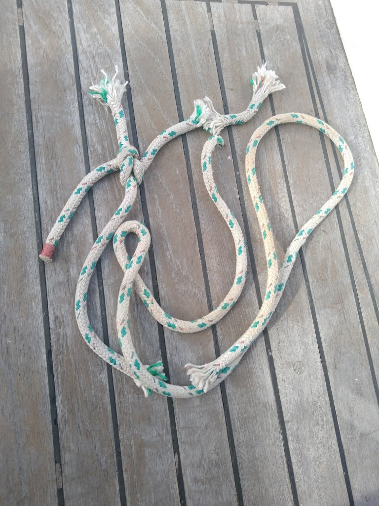 This morning I set about freeing up the propeller. First I unwound the propeller shaft from inside the boat three turns, hoping the rope would unwrap a bit. Then I tried teasing the rope out of the propeller from the dinghy, it didn’t work. I really didn’t expect it would work but am willing to try almost anything rather than get into the water.