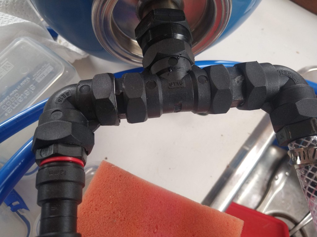 After a bit of trial and error, adjusting the bladder pressure with the help of a bike pump I was able to get the tank to hold the maximum water capacity before the pump cycled on. But I was not happy. Over the years, the Jabsco water pump has developed an annoying noise when operating and I wanted a bigger accumulator tank to reduce pump cycling. I looked for a solution and as usual the space constraints on board seemed to limit my options. I could not see an alternative but kept the idea alive at the back of my head.