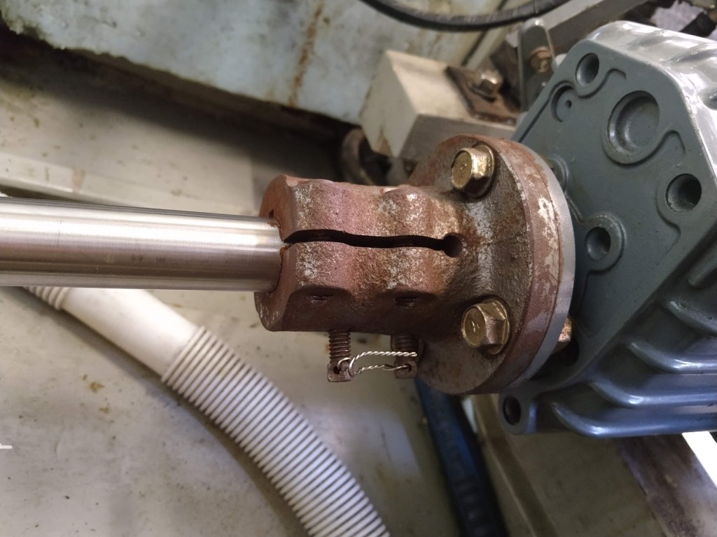 Before refitting the coupling to the shaft, I took the opportunity to replace the PSS dripless seal bellows. The manufacturers recommend changing the bellows every six years. The existing bellows have only been on for five years but as the shaft is disconnected it seems a good opportunity. I also replaced the raw water discharge hose to the shaft seal with a stronger braided hose that’s more suitable for use below the waterline, its not shown in the photo below. I now have peace of mind for another six years.