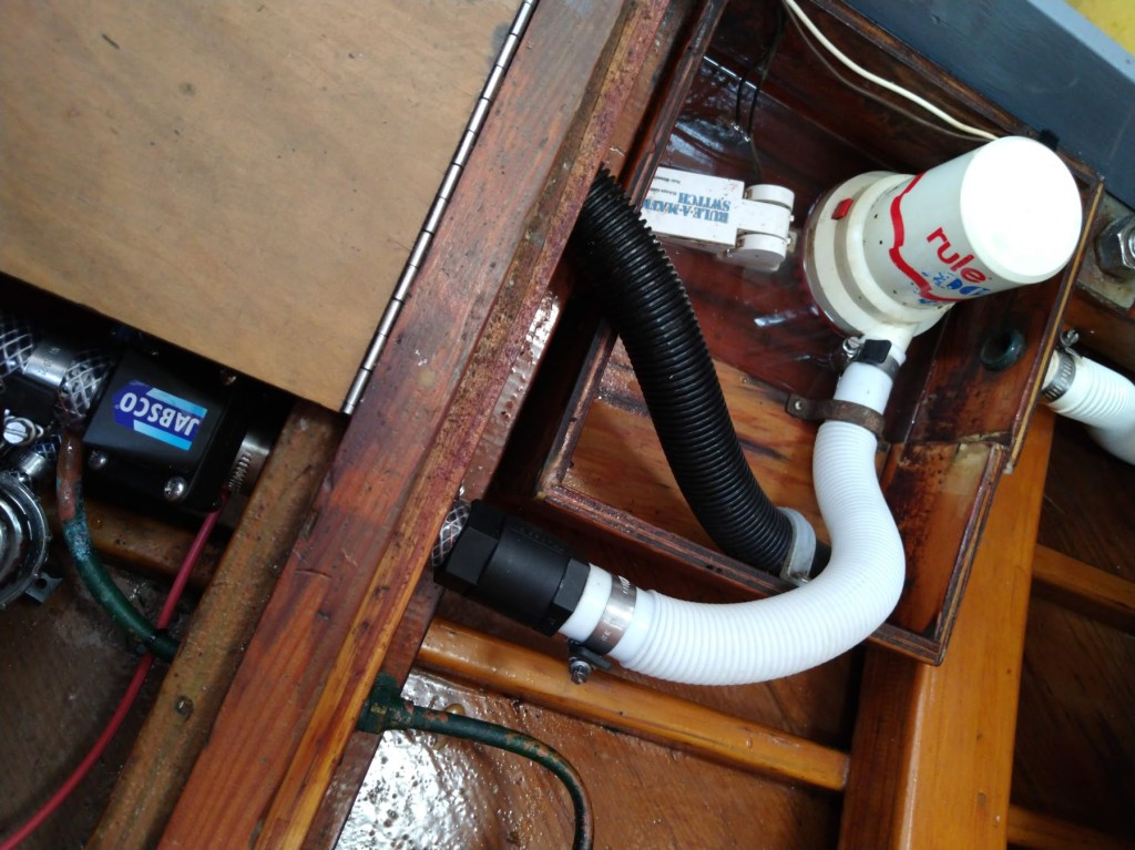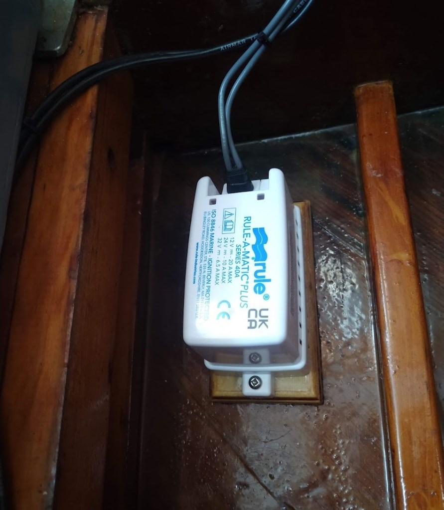 On Truce I run a dry bilge, any water in the bilge is a sign of a leak of some sort. The bilge pump and float switch are situated in a box above the bilge. Any water in the bilge would have to rise about 200mm before it overflowed into the bilge box and activated the bilge pump. This arrangement prevents any discharge of diesel or oil accidentally spilled into the bilge. There are two lines feeding into the bilge box, one is the drain from the anchor locker and the other is the drain from the shower tray.