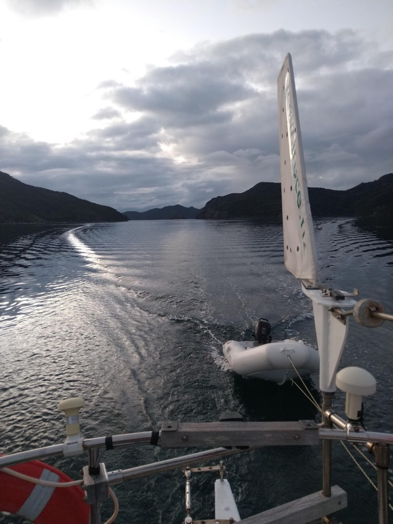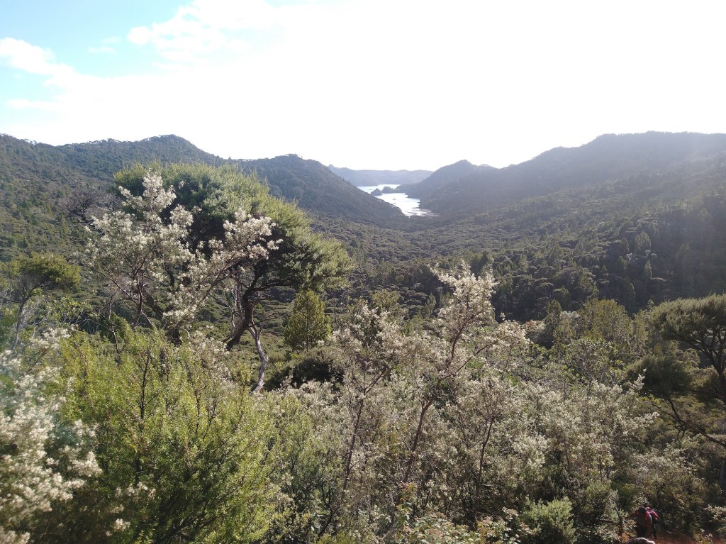 After a lazy morning we went for a walk ashore, up the kiwiriki track. After an hour and a bit it seemed we had reached a high point and the track started descending. Not wishing to go down and up again we decided to stop for lunch and return the way we had come. One advantage of climbing to a high point, we received a phone signal and the outside world came flooding in.