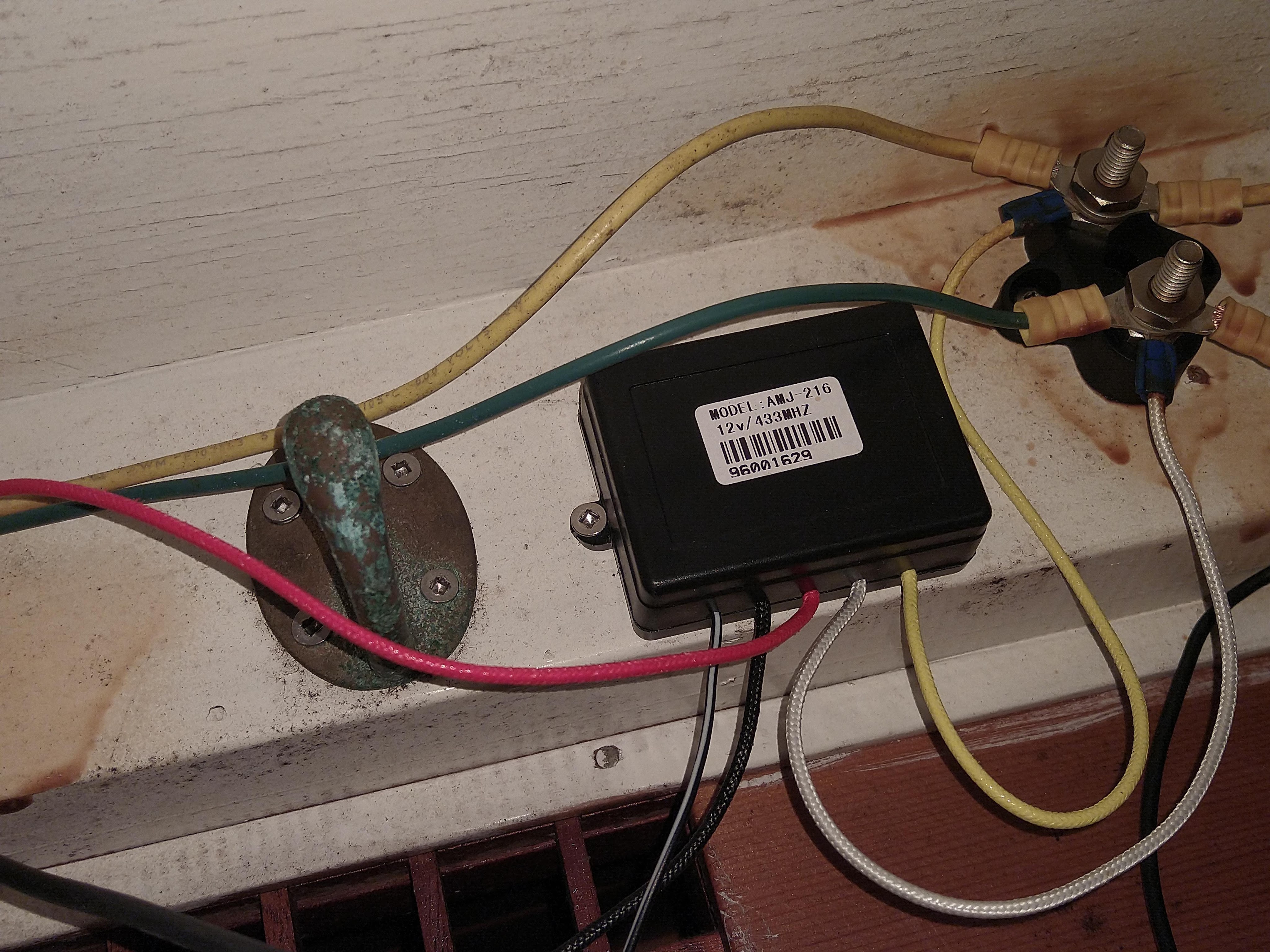 Wiring the unit into the existing system was easy, just four wires to connect. Red and black wires for positive and negative went into the existing power supply. For the yellow and green wires I put in a double stud and crimped terminals to the wires and connected than together. The control box I screwed on the bulkhead in the anchor locker and left the antenna wire hanging down. Then I gave the connections a liberal spraying with CRC Soft Seal.