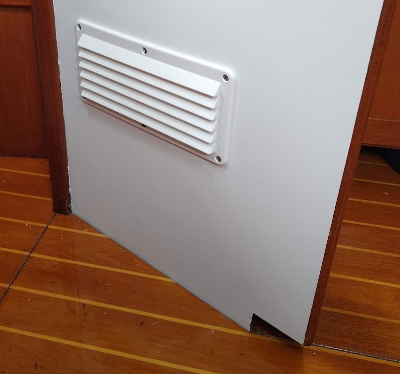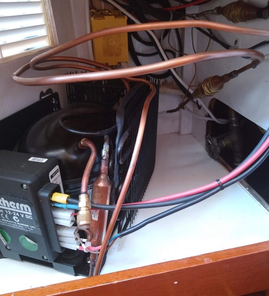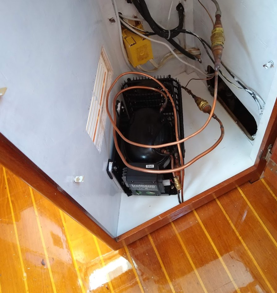 It turned out to be a straightforward job. I placed the compressor unit into the bottom shelf of a food locker in the Galley. This location had the advantage of being open to the bilge where I hoped the cool air could flow up and provide some cooling effect for the compressor. Into the side of the locker I installed a vent to allow the warm air to escape from the compartment.