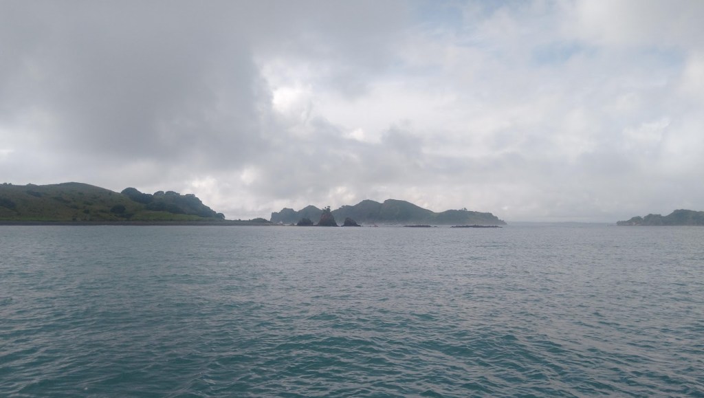 After an early cup of tea and three gingernuts for breakfast I weighed anchor and headed out of Whangaroa Harbour. The sea was a bit lumpy from almost dead ahead, it was slow going with the motor, but after a couple of hours we rounded Flat Island and bore away down Cavalli Passage. Needing a rest from motoring I ducked into into Papatara (Horseshoe) Bay and anchored for brunch just after ten. We were the only boat around and the sun came out for an hour, brunch in the cockpit was a pleasure although we rolled around a bit in the swell curling around the island.