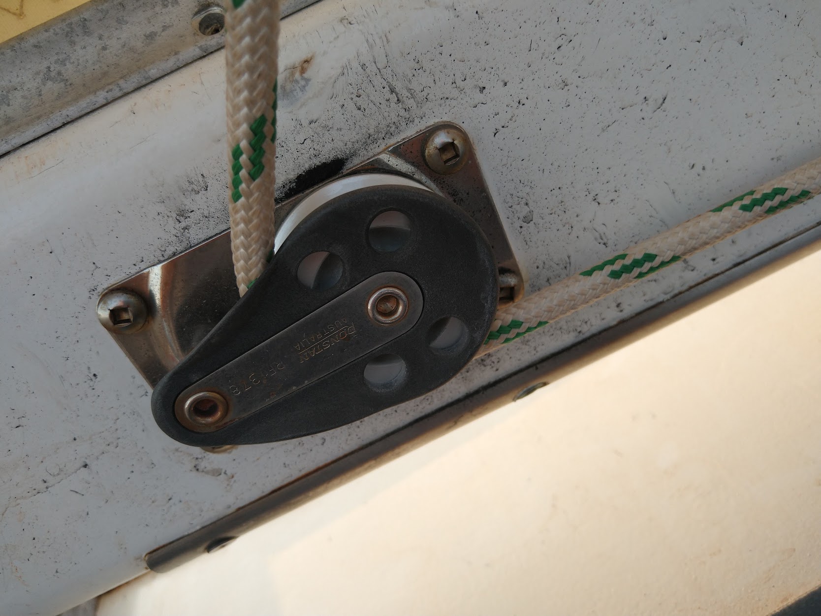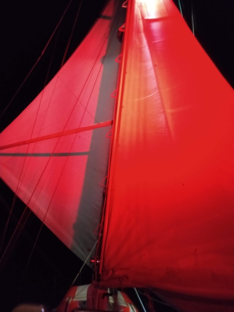 I passed the time by doing odd jobs. I wired up the floodlight on the new antenna mast. Now we have a wonderful bright light on deck and sails, either red or white. New lines were spliced for the traveller to replace the dyneema core lines I had used previously. I have gone back to polyester braid that is more elastic, an advantage in a gybe.