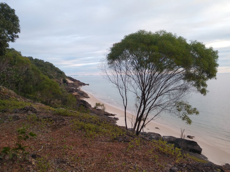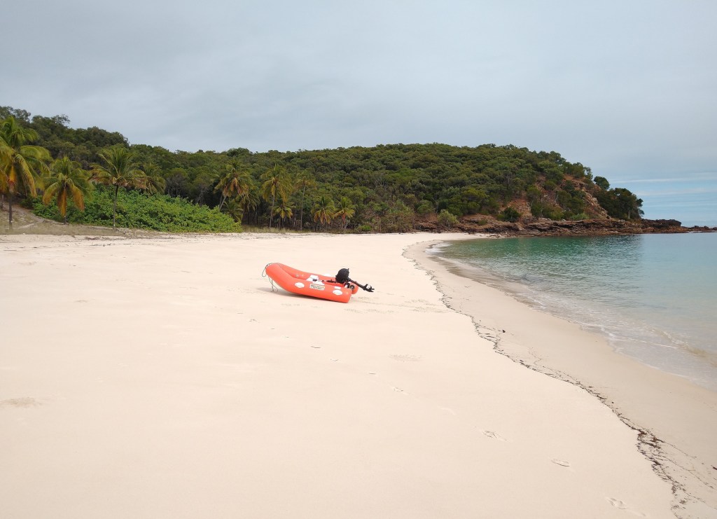 The anchorage was visually impressive, beautiful looking beach with a fringing reef, scrubland ashore rising to barren hills. On the beach there were three sets of dragon tracks. In the late afternoon we had a rain shower, lovely fresh smell of rain on land, refreshing but it was over too soon. Then a large black pig came on the beach and ploughed a long furrow in the sand with his snout. I get the impression its dragons in the morning and pigs in the afternoon.