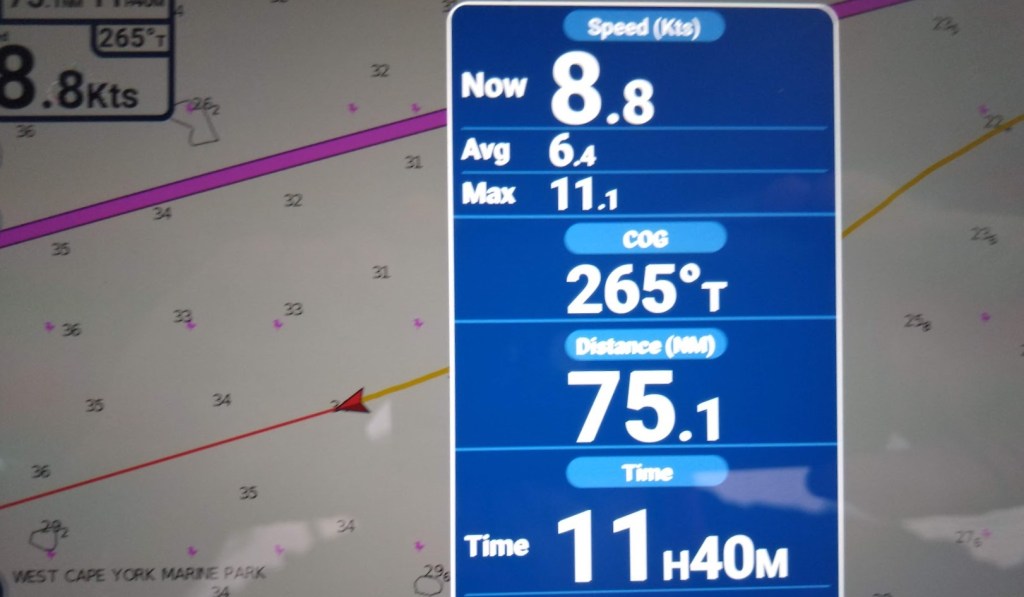 This morning I has an alarming experience. As we were approaching the coast I knew that there were offlaying reefs. According to the chart the track I was taking would take us clear inside the reefs in deep water. The chart showed the current water depth to be over 200m. However, for some reason I decided to switch on the depth sounder. Shortly after the 5m shallow water alarm went off. This didn’t cause me any concern as when off soundings the echo sounder can turn up spurious readings. I went to cancel the alarm and saw that the sounder was showing 4m and decreasing. Whoa! Something wrong, immediately I put the engine in neutral and looked over the side. Amazingly, I could see the coral bottom, very close on the starboard side. The port side seemed clear. I put the helm hard to port and immediately got back into deep water.