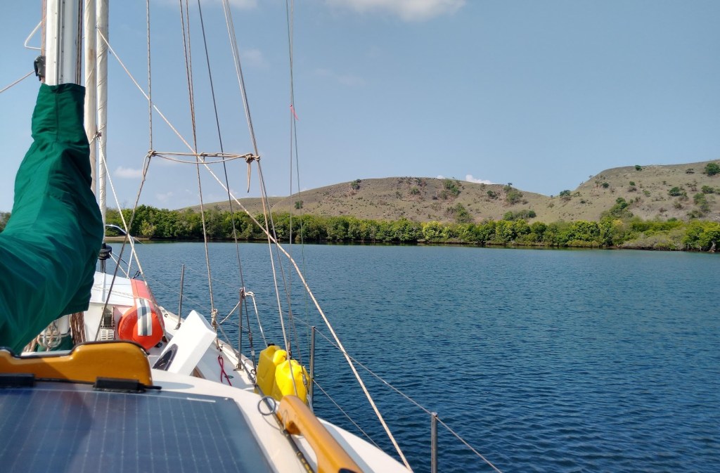 Another day of no wind and motoring. By mid afternoon we were anchored in 20m of water in the most picturesque Bay. Protected on all sides, the sort of anchorage where a sailor can relax in the knowledge that anything short of a storm is not going to cause any problems. By far the best anchorage for protection so far in Indonesia. Peaceful, relaxing and surrounded by birdsong.