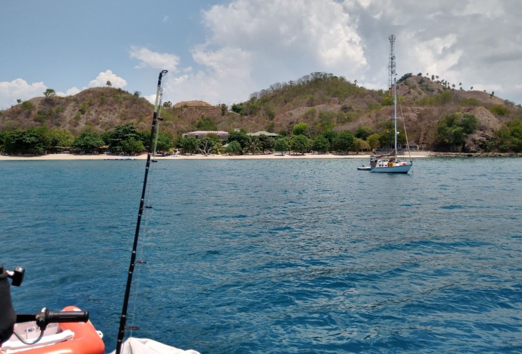 The Silvia resort has a plastic floating dinghy dock, very convenient for getting ashore. The main town is a couple of miles away with a very crowded anchorage, local boats, fishing boats and numerous tourist boats running diving trips and ferrying tourists to the Komodo National Park to see dragons. I had sundowners on the beach and an evening meal at the hotel, very relaxing.