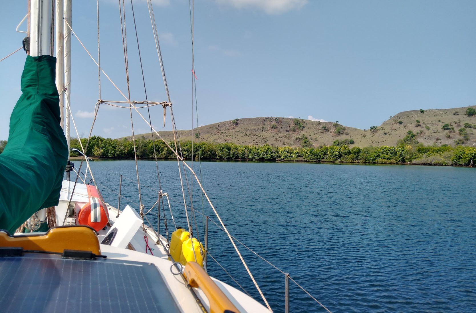 Anchored in Puerto Princesa, sails off for repair. Photo Ray Penson