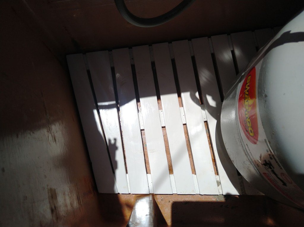 After cleaning out the gas locker I had to refurbish the grating that the gas bottles sit on. The grating was heavily soiled and marked with rust stains from the bottom ring on the gas bottles, they had been sitting and festering rust. Gas lockers should be closed off from the rest of the boat and ventilated overside. On Truce the gas locker has an upper vent and a lower drain.
