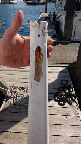 As you can see from the photo the rot is quite extensive and close to the tip. It could have lasted a bit longer but it would have failed in heavy weather when under high stress, no doubt at two in the morning – not a nice thought. I feel much better now that the job is underway and an new spreader will be fitted soon.