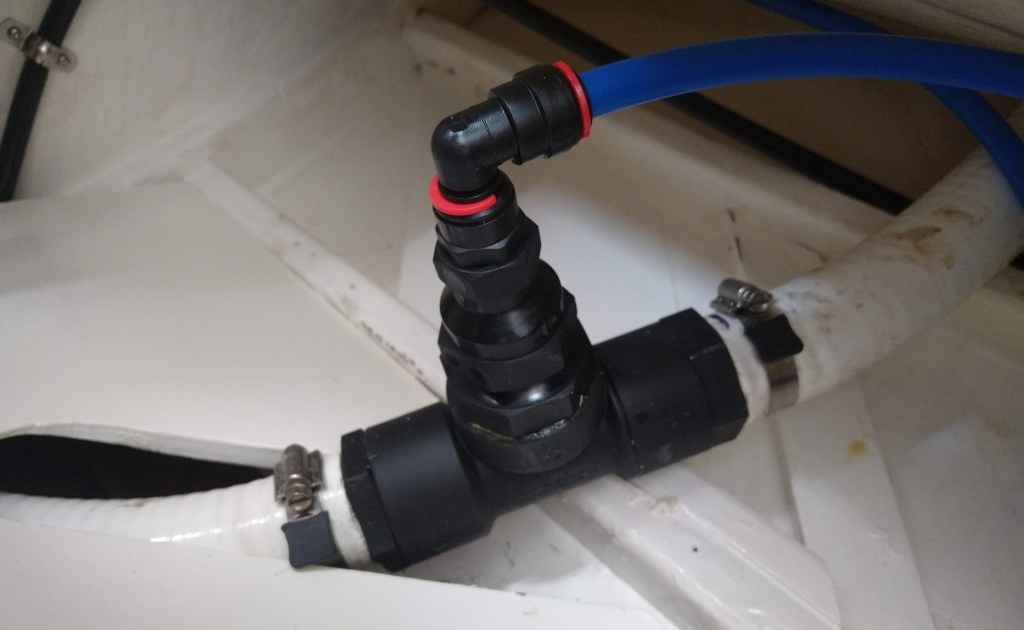 The existing seawater inlet was used for the water supply, the same supply that is also used for the deck wash pump. A small boost pump was added into the deck wash line to boost pressure to the high-pressure pump. This arrangement will allow the deck wash pump to act as a boost pump in the event of a failure of the small pump. An isolating valve separates the water maker from the deck wash when in use. The brine water drains into the cockpit and goes down the cockpit drain, no need for another through hull fitting.